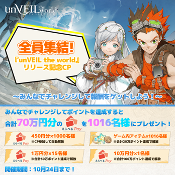 本作の配信を記念して、公式X(https://x.com/unveil_JP)では、「総額70万円分のえらべるPayがもらえるリリース記念CP」を10月16日から10月24日まで開催予定です。